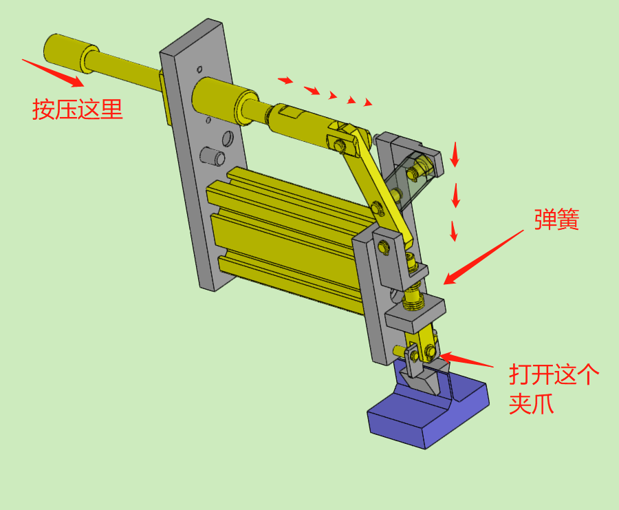 這個簡單結(jié)構(gòu),可以實現(xiàn)的,夾爪下壓打開,上拉夾緊。 |