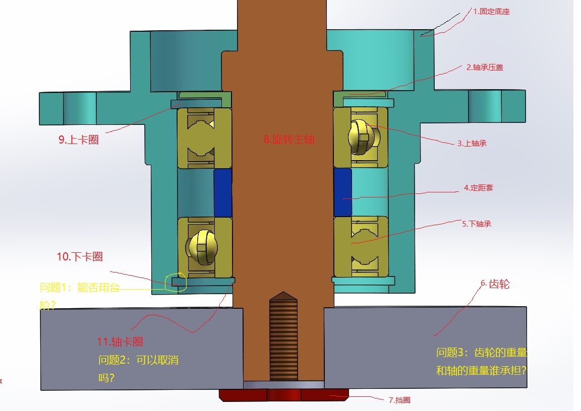 正文摘要:如圖:零件1為固定底座, 1. 用卡圈限位,改成臺階限位是不是更好點(diǎn)? 2.軸上面的卡圈槽有必要嗎?可以取消嗎? 3.齒輪和主軸的重量誰承擔(dān)? 最后是不是都壓到卡圈上去了? 這樣也行? 卡圈限位變成承受力了? 這個(gè) ... |