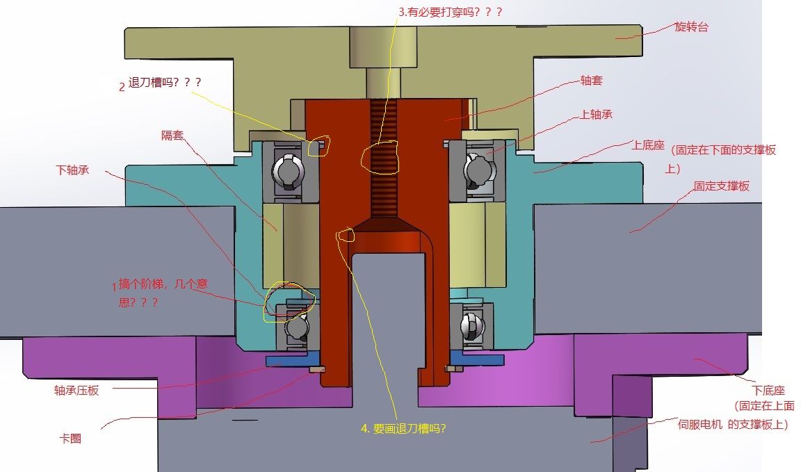 1.圖一的上底座和下軸承安裝處,搞個階梯,幾個意思? 設計有問題。 2.圖一 軸套的槽為退刀槽嗎? 不畫行嗎? 理論上要有。 3圖一的螺紋孔有必要打穿嗎? 沒必要。 4.圖一 軸套內孔的尾端要畫退刀槽嗎? 不用 5.圖二 上底座安裝軸承的轉角處是90度,能否加工出來? 如果實際加工出來不是90度,會影響安裝軸承的 去問問加工的。 6.請點評圖一和圖二結構 第二個比第一個好一點。但也很爛。 |