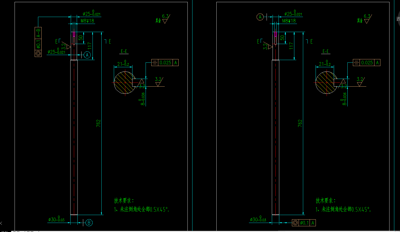 左邊的標注方法是錯誤的吧,用自己做基準來要求自己同軸? 右邊長短邊做基準實際都可以,要看哪邊更重要(是主要定位尺寸,例如軸套安裝位等) 例如短軸端做基準,可以先加工短軸端,然后夾短軸,頂長段加工,檢驗也比較容易,夾短軸,測量長段 反之也可 或者頂一端,一次加工(這應該是最常用的),從標注來說,無所謂基準 個人傾向短軸做基準,否則長軸還得檢驗直線度 |