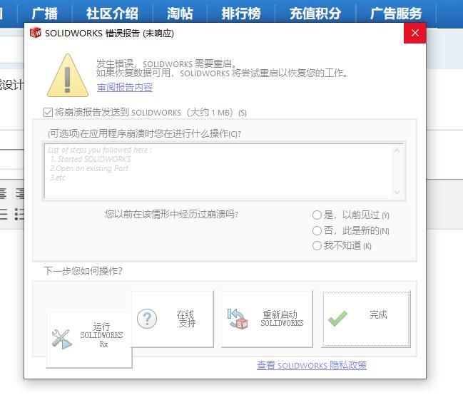 真的是打異形孔引起的崩潰嗎? 新建個(gè)零件只是打異形孔試試? 做幾個(gè)單因素測試。比如只有 solidworks運(yùn)行的情況,只有異形孔特征的情況。 如果確實(shí)是打異形孔引起的。那么重置注冊表或許管用。 |