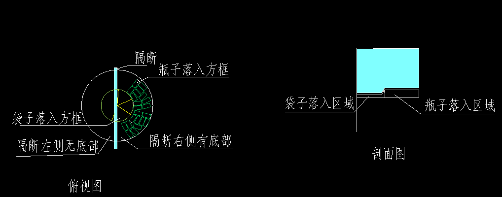 用類似機場箱包斜坡傳送帶怎樣,下部做一個比較矮的擋邊,瓶子滾落下來,袋子靠摩擦力附著在傳送帶上 |