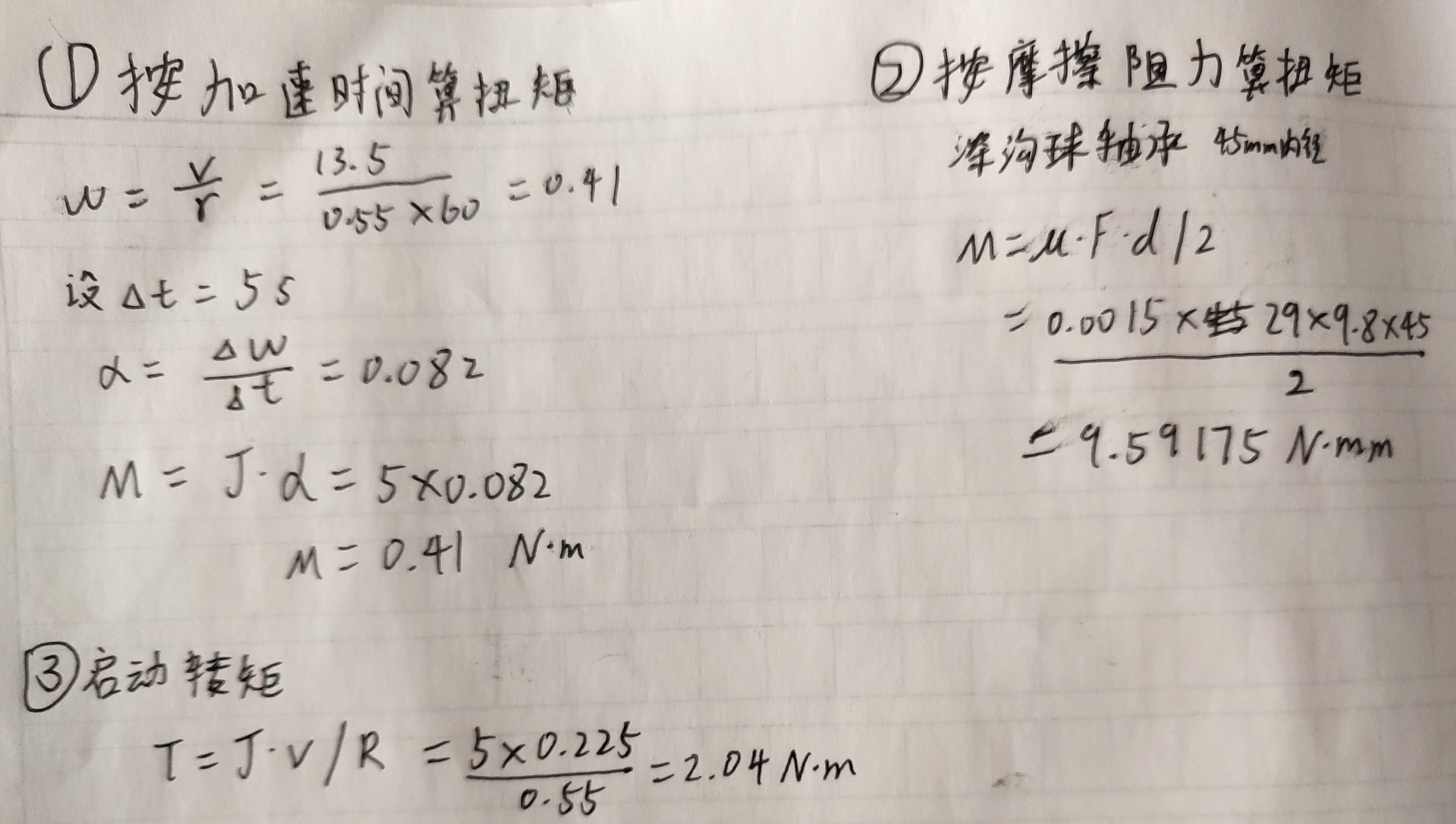 本帖最后由 2011ayoon 于 2020-4-16 12:47 編輯 ddssvfg 發表于 2020-4-15 17:01 暈,搞錯了,直接用電機轉速帶入計算了,按繞輪轉速計算值是0.4w ![]() 不過像這種情況,恐怕應該考慮,繞絲輪偏心(重心偏心)的情況,比如假設重心偏心10mm這樣慣性矩和重力矩的變化 不過這種大部分應該靠經驗來判斷了 你的計算方法3是錯誤的,應該是慣量*角加速度,所以公式應該再除以加速時間,如果按5秒計算,1、3就是一樣的 |