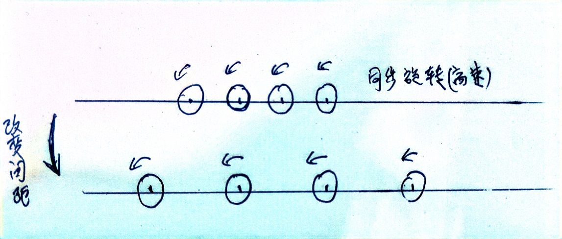 這個方法應該不少吧,簡單來說,帶,鏈,齒輪傳動都可以實現啊,你只要把在你要用的任意兩個輪子的中間設置一個惰輪,且與它兩側的輪子保持固定距離就好了啊。你要改變間隙就直接把那5個輪彼此拉開好了,如果想容易控制那么加一個貫穿五個輪子的的滑動桿就可以了 |