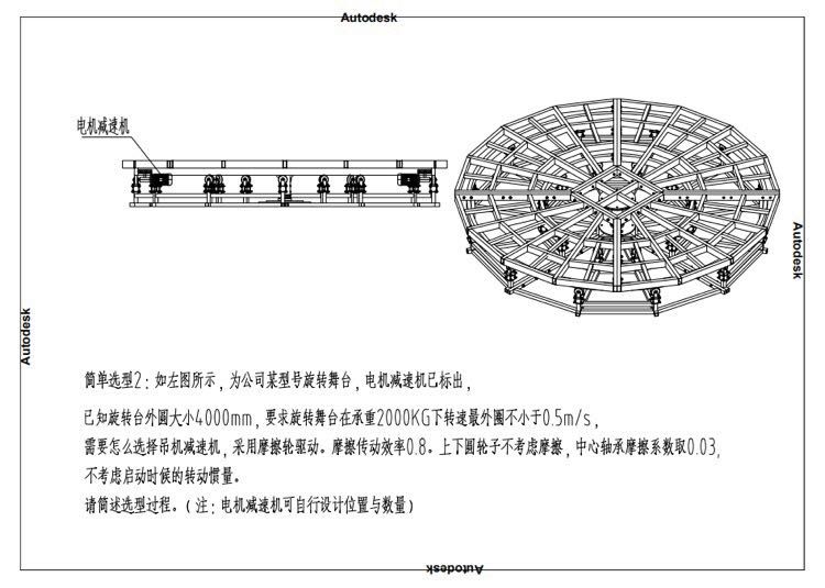 本帖最后由 LiNing_jrjub 于 2020-7-3 11:09 編輯 出題者說,不考慮啟動時候的轉動慣量,那意思就是只需要考慮舞臺平穩運轉時候狀態就行了 舞臺進入平穩階段了,那么,電機僅僅需要克服摩檫力損失、阻力損失、傳動效率損失等,讓舞臺保持旋轉狀態即可。 可以先任意定一個電機減速機的位置(比如就定在舞臺最外圈),然后再根據最外圈不小于0.5m/s這個參數,大致確定摩擦輪直徑、減速機的減速比等,然后再一步一步往下算。算出來結果還得經過校核,如果不匹配,說明我們最初設定的一些值有問題,還得根據計算結果對最初設定的參數做一個調整,然后再繼續重復計算過程。 這個過程有點像上學那會,老師讓設計齒輪箱 此題目缺少很多必要的條件,出題者的目的也不是讓你算出來,不是讓你列一大堆公式。而是讓你講思路,講述過程。 |