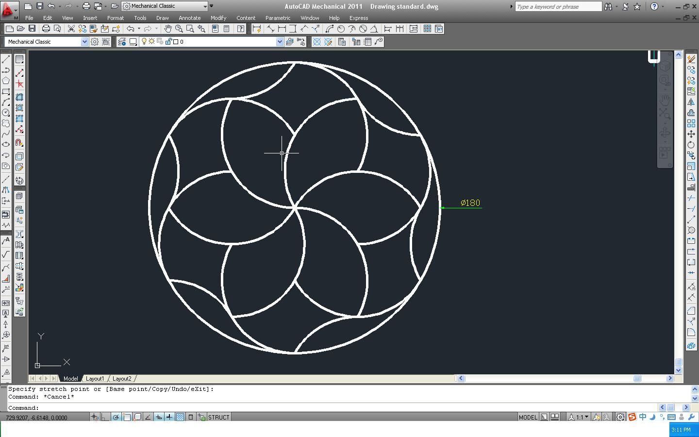 我用SolidWorks畫的 先畫一個φ180的園 再畫6個φ90的園 第三個園 你看圖 最后就是剪切 |