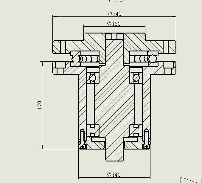正文摘要:轉盤主軸結構,,負載700kg 低速間歇旋轉 5分鐘轉動一周 扭矩80N.M 請大家指正 圖示為主軸結構,上端法蘭盤安裝直徑1.8m 轉盤 ... |