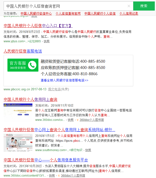 正文摘要:本帖最后由 面壁深功 于 2017-8-13 23:27 編輯 為了取得一份個(gè)人信用征詢報(bào)告 進(jìn)入360后輸入“中國人民銀行個(gè)人征信查詢官網(wǎng)”,結(jié)果這目標(biāo)被其它霸了屏。 ... |