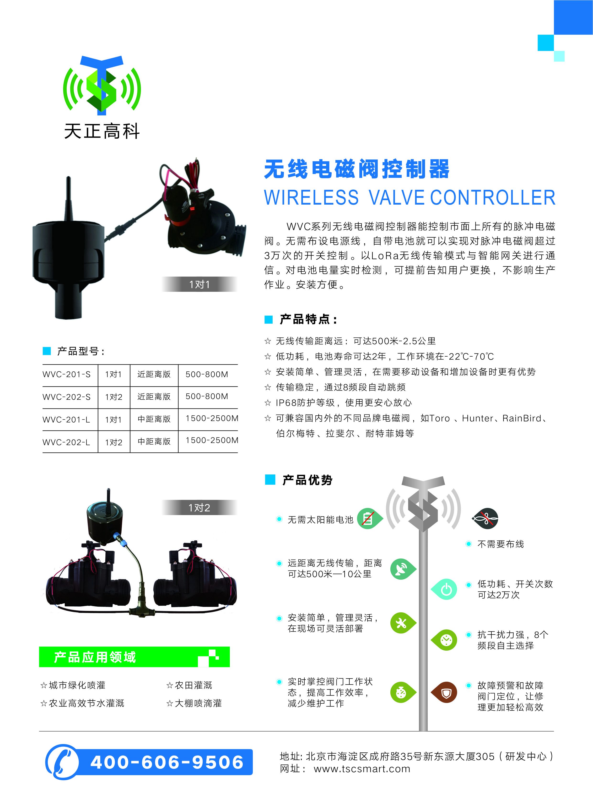安信高科(北京)科技有限公司15910447326研發生產的EcosyeSVC-2.0電磁閥控制器主要功能為遠距離控制脈沖電磁閥開關。 控制田間灌溉電磁閥的開啟與關閉、監測灌溉閥的開關狀態,每個閥控制器可以控制兩路電磁閥的開關。無線電磁閥控制器能控制市面上所有的脈沖電磁閥。以LoRa無線傳輸模式與智能網關進行通訊。對電池電量實時檢測,可提前告知用戶更換,不影響生產作業,安裝方便。 可兼容國內外所有系列電磁閥(如伯爾梅特、雨鳥、托羅、耐特菲姆、BACCARA、拉斐爾、ARTHAS、華最、贊臣等)。采用專業級防護外殼,防水防腐防潮防紫外線,支持IP69防護等級。具有遠程控制、定時控制、傳感器聯動控制等功能。 |