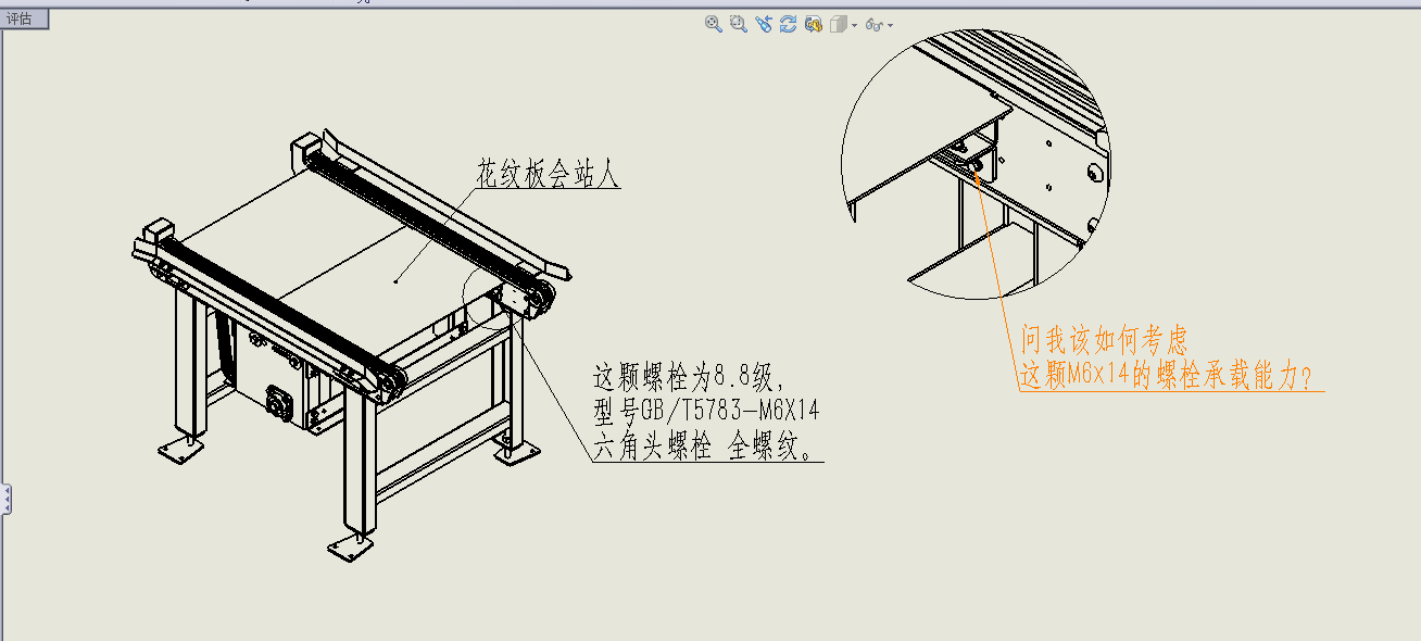 正文摘要:各位大佬: 如圖中所示,花紋板是用來站人的。通過型號GB/T5783-M6X14六角頭螺栓 固定在設備上,我該如何考慮此螺栓的最大承載能力? ... |