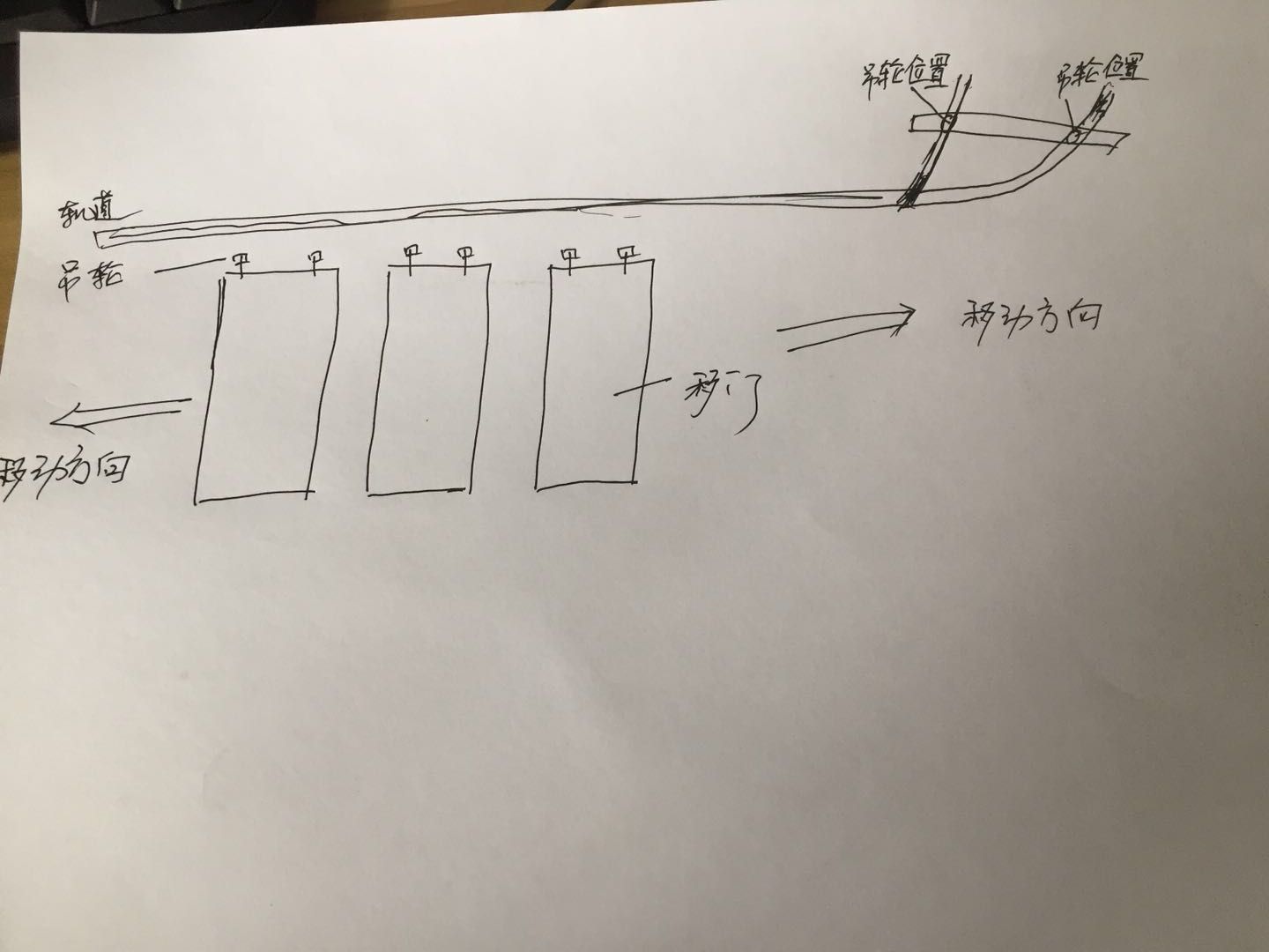 非得是兩個吊輪嗎? 如果是中間一個吊輪,每扇門用鉸鏈連接呢?需要的話,鉸鏈還可以做成180度時鎖住。 |