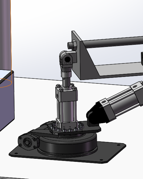 油缸/氣缸不能既做力的輸出單元,又做力的導向單元, 在活塞桿完全伸出后,導向距離太短,容易出現徑向彎曲; 且,常規油氣缸不能承受較大的徑向力(定制缸除外) 此處,豎直油缸可以增加導向機構,油缸只做軸向力的輸出單元,不承受徑向力。 看截圖,應該是:底座旋轉+兩油缸組成一個立面雙自由度驅動機構,有點類似:“三坐標機械手” |
