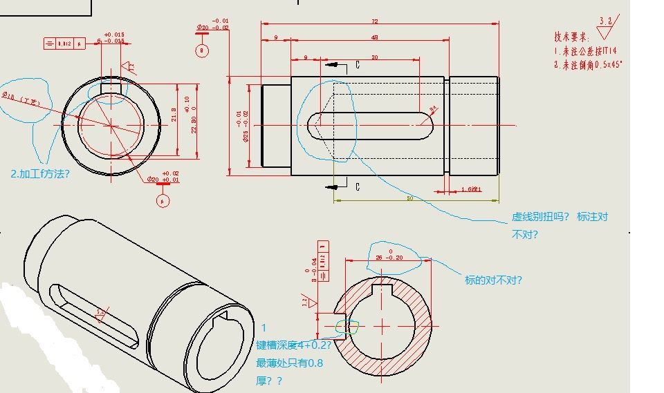 1-鍵槽尺寸標注應該沒問題,不過,最大外徑是20(應該是30??),小一點的左端外徑是25???不大對吧,你這個可是有點違反常理啊 有個小看法,內鍵槽標注方式是不是有點不大對,一般來說,不應該標注一個22.8就可以了嗎,怎么還在增加一個21.8??標注重復 2-如三樓說,加工可以直接插、刨。壁薄是由于外徑過小,外鍵槽過大導致的,建議:1,使同步輪與旋轉軸外徑直接配合。2,增大旋轉軸外徑或選用鍵尺寸小一點的。——疑問:鍵槽選擇是經過負載計算的么? 3-內鍵槽加工,建議增加一個退刀槽——有個小疑問,內鍵槽是要加工半圓形的?直接平口的不行么,使用C型單圓頭平鍵? |
