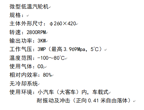 正文摘要:微型低溫汽輪機: 主體外形尺寸:260*420MM 轉速:2800RPM 輸出功率:3KW 工作氣壓:3MP(最高3.969Mpa,5度) 溫度范圍:-100~80度 使用氣體:二氧化碳 相對內效率:80% 無冷卻系統 使用環境:小汽車(大客車 ... |